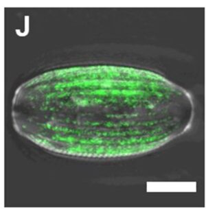 Ein Algenprotein wurde durch genetische Modifikation mit einem fluoreszierenden Protein markiert. Nach Aufreinigung der Silikat-Zellwände der Mikroalgen war es dort weiterhin fluoreszent vorhanden. Das identifizierte Protein könnte z.B. für die Funktionalisierung von Mikropartikeln eingesetzt werden.